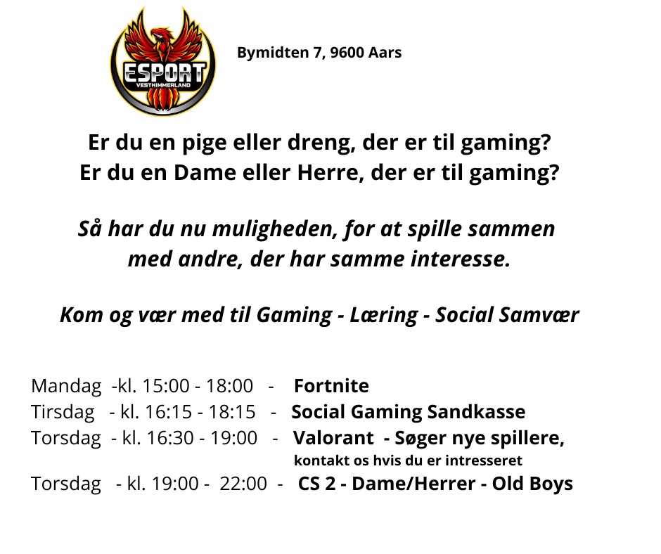 | Esport Vesthimmerlands klublokaler | Valorant - Torsdag kl. 16:30 -18:45 |